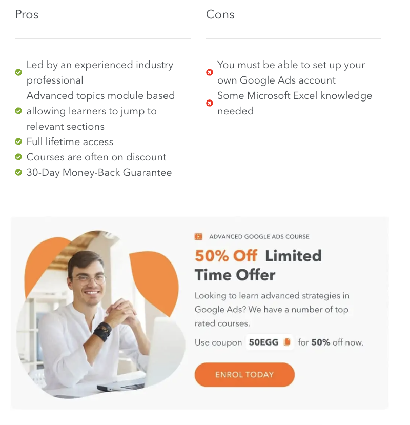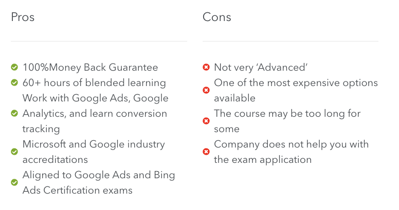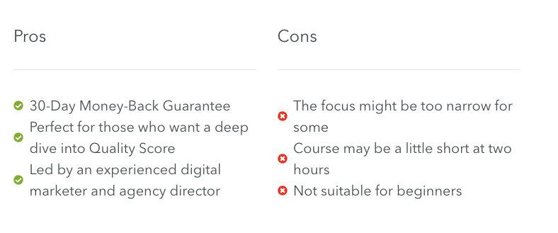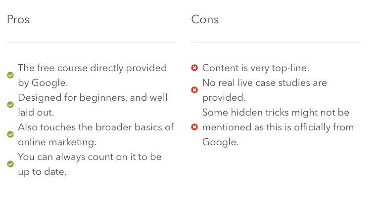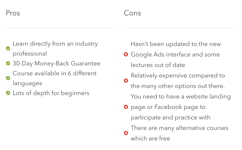 The course coverage is also very broad so it is great for beginners looking to get a strong overview into starting with Google Ads. One of the main downsides is the material can be outdated as it was recorded originally in 2016 and has not been updated, probably because it covers so much material.
