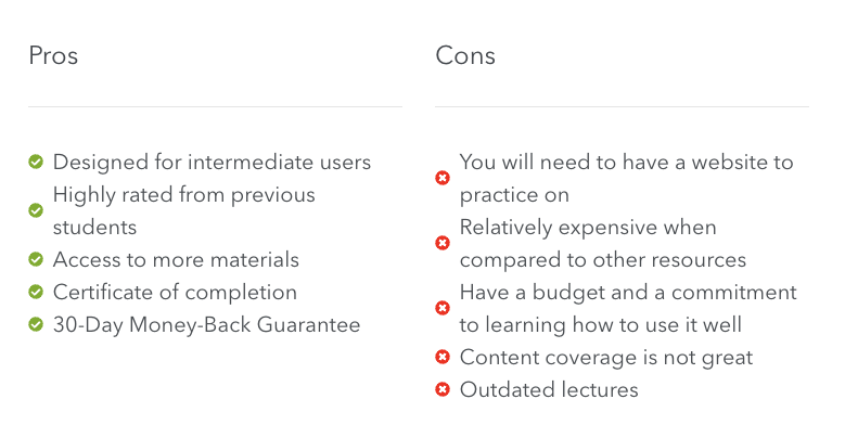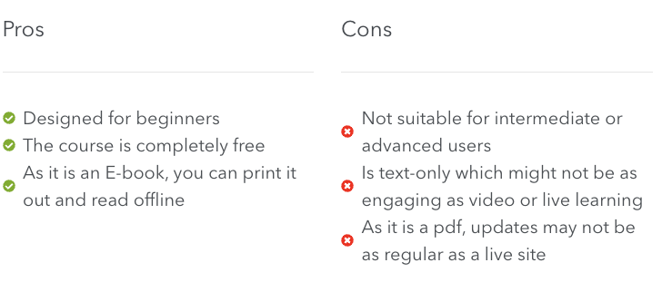 The course is not video-based, it comes in a written format which allows you to learn at your own pace. However, the big downside is that it is not interactive. While there are screenshots, it doesn’t actually show you how to implement practices.